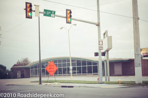 Here's another mid-century styled building in Tulsa, OK. There were no signs on this one. The building features the googie looking blue green colors and diamond facade. 09-17
