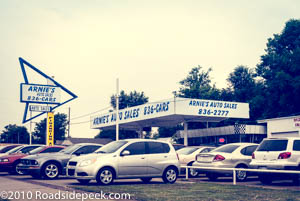 Here's a used car dealership names Arnie's Auto. Arnie's still stands along old Route 66 in Tulsa after many years. Check out the wide boomerang arrow that points the way to a car deal or two. 08-17