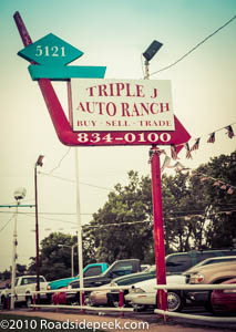 Another Route 66 used car lot, Triple J Auto Ranch has a big red arrow that points the way into car sales. 08-17