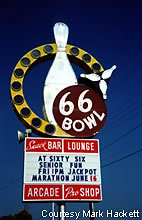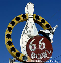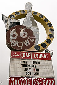 To the right is a photo of the 66 Bowl in summer 2010. See how the pain has chipped off the sign. Not sure if the neon was still working when the bowling alley closed down.