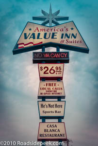 This sign for America's Value Inn is a rather tall sign. It can be seen as you travel down Route 66 in Tulsa. Check out the starburst on top of the sign. Not sure what the sign looked like before the plastic fantastic took over. 08-17