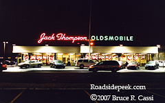 Jack Thompson Oldsmobile was known as the "home of the Free Loaner Car". The main building's showroom only held 8 cars, but behind the service department was a 50 car indoor showroom. This rooftop sign burned bright for over 50 years. On August 2, 2002, through tear filled eyes I watched, along with former employees, mechanics and customers as this dealership was reduced to a pile of rubble. 04-07