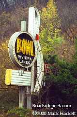 Here's the "ultimate 10-pin graveyard." Riviera Bowl of Bellaire, OH is about to be run over by the nearby brush, however the marquee towers up and stand tall over it. 11-00