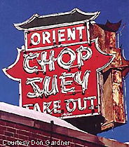 Chicago, IL is home to this Chinese restaurant delight called the Orange Garden. Located in the Lakeview area of town, the Orange Garden prominently displays the words "chop suey" on its sign leaving no doubt as to the type of cuisine served here. According to the Chibbqking site, the restaurant appears from the 1950s era with its old black leather booths and dim lighting. 07-09