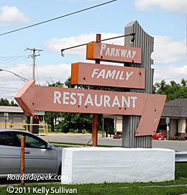 Mendota, IL is home to the Parkway Family Restaurant and Pancake House. Look for this peach colored sign to direct you in for some hearty eats. 07-11