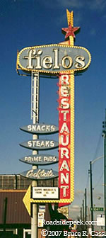 When somebody asks me what my favorite neon sign is, I say Fielos Restaurant on Western Avenue in Chicago. This double sided sign was over 25 feet tall. Notice the maintenance ladder under the letter F, also ladder rungs can be seen on the left side of the word "Restaurant". Fielos had undergone many owners over the years and in 2005 the sign was taken down. The business now operates under a new name. 06-07