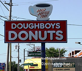 Doughboys Donuts is a Rockford, IL delight, featuring fresh baked donuts every day. From the looks of the sign, Doughboys is afraid of proclaiming that they have good coffee too. 07-11