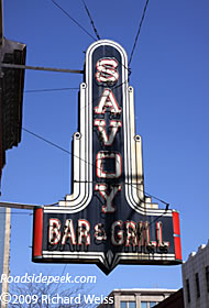 The Savoy Bar & Grill is located off the roadside in Flint, MI. The Savoy features a deco looking marquee hanging over the side walk and the building has a colorful mural to boot. 06-09