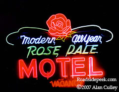 This rather eye-catching neon sign fro the Rose Dale Motel in Rochester, IN features a neon lit red rose and fully working neon lettering. The marquee advertises that it is "modern all year". 07-07