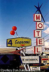 Motel marquee sports double boomerangs and numerous shapes. Still