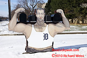 An interesting and somewhat strange sight found in Plymouth, IN is this sign of a humorous body builder holding up some mailboxes in front of Fitness Things. Yup, you are seeing the "D" for the Detroit Tigers on his shirt! 02-10