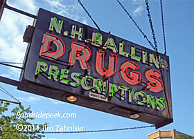 Here's another classic neon sign from Chicago. The N.H. Ballin Drugs still features intact neon lettering as it stand along busy Lincoln Blvd. 07-11
