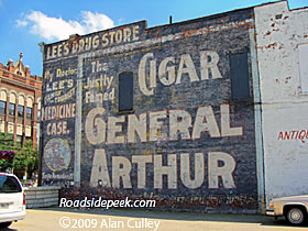 This ghost sign on the wall of this look to be early turn of the century building features advertising for "The justly famed General Arthur cigar", "Lee's Family Tourist" and "medicine Case". A look at this wall is a distinct throwback to the days when the old main streets of towns were the central hub for businesses. 05-09