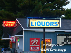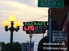 This old neon sign is for the Package Liquor Store in North Judson, IN. Even with just part of the "liquor" part of the lettering lit, the sign beats other modern signs in its ability to catch the eye of passersby. 11-08