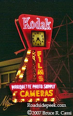 This early 60's Kodak Film sign on 63rd Street in Chicago at the Marquette Photo Supply still shines brightly in 2007. I'm not sure how accurate the clock is. 06-07