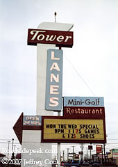 UPDATE 03/12 : The bowling alley is alive and well, including the sign. Tower Lanes in Tacoma WA is not nor never has been demolished. It is currently owned by a group lead by Bob Hanson and Jeanne Naccorato. (Original posting incorrectly stated Tower Lanes had been demolished) Many thanks to Chris Purley and Dave Hanson for update. 03-12