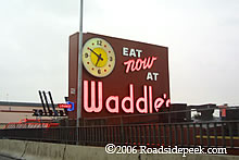 As you travel down the highway, you'll suddenly run across a neon sign telling you to "Eat Now at Waddle's". After blinking rapidly a few times, you'll pull over and see the Waddle's coffee shop in all its mid-century modern grace in Portland, OR. Unfortunately, the place has now turned into a Hooter's Restaurant and the sign has been altered. 12-06