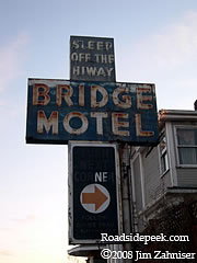 The Bridge Motel is located off of Aurora, the main drag into Seattle. Although the sign still says to "sleep off the hiway", the Bridge appeared closed. 01-08