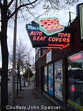 This fine roadside neon sign for Mac's Auto Seat Covers is still lit up in Seattle.