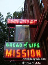 The Bread of Life Mission has served Seattle's needy and homeless population for over 60 years. The Mission is located in the historic Pioneer Square District. Check out this neon sign in front of the entranceway. 03-06