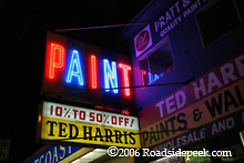 The colorful neon catches the eye at the Ted Harris Paint store in Vancouver, B.C. Check out how the red and blue neon letters contrast well with each other. 03-06