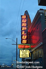 The Best Buy Surplus sign still retains flakes of its original paint, but it's nice that that the neon tubing on the sign still works! 07-07