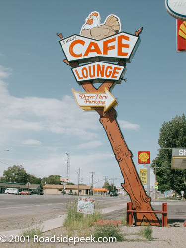 Check out this old sign for the Lemieux Cafe in Green River. The restaurant was built in 1975 and was located along the main drag in town. Word is the Lemieux Cafe closed its doors around 2007. The sign was still there as of a year or two ago. 07-25