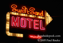 The Sun-N-Sand Motel in Kanab, UT has a neon lit marquee that points the way into the motel.