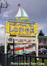 This sign for the Mel-Haven Lodge is a good example of what unique marquees were all about. Check out the sailboat on top of the sign and the colors used to catch the attention of weary motorists dreaming of rest and relaxation.