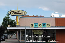 This old roadside store is for this Clothiers and shoes store in Mountain Home, ID. The two colored letters spelling out "shoes" is a reminder to the Kinney shoe era. 10-06