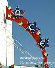 Here's a rather unique marquee for the Ace Theatre. This Wendell, ID theatre really captures the eye of travelers and potential visitors alike with this streaming and colorful marquee. 08-06