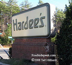 This is a sign using the old style logo for Hardee's. It is on Creedmoor Road in Raleigh NC. This logo is not seen these days. 08-08
