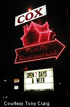 Here's a nice shot of the neon marquee for the Cox Family Restaurant in Morehead City. This place may be worth a stop. If not for the food,