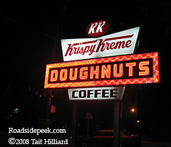 The huge Krispy Kreme Doughnuts sign is located on Person Street in Raleigh, NC near the campus of Peace College. The sign was on around 4am but unfortunately they were closed. 08-08