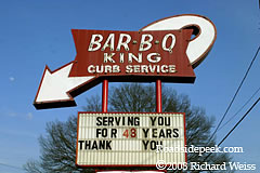 Check out the Bar-B-Q Center located in the town of Lexington,NC. This eatery features a marquee that states its barbecue is pit-cooked and that the place offers curb service. 03-08