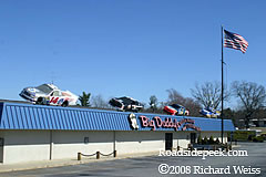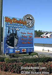 While Mooresville, NC is known as "Race City USA" you have to leave the downtown area to really see all the NASCAR stuff. Just west of town is Big Daddy's Restaurant and Oyster Bar which is a curious combination of a fish joint and race cars. The sign looks like something you would expect to see at any New England seafood restaurant but the building, with all the style and grace of a modem warehouse and a roof lined with race cars, lets you know immediately that you could only be in NASCAR territory. The owner was there when I stopped by and told us the yellow truck took the number once spot in last years race circuit and as he was a personal friend of the driver, the driver wanted him to have the truck for his restaurant. If you want a seafood with a pinch of NASCAR, this apparently is the place. 05-08