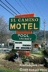 The El Camino Motel was also found in Cherokee, NC. The old motel marquee looks like it still had its neon tubing intact and the pool is advertised prominently on the sign. 03-08