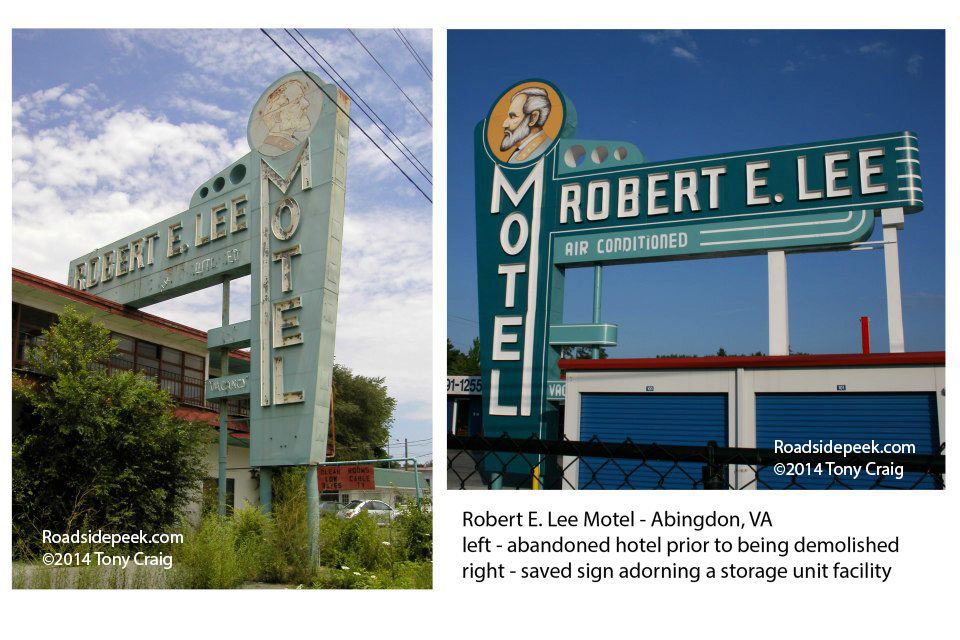 UPDATE 06/14 : The Robert E. Lee Motel sign was rescued and repainted. No neon any more though. Many thanks to Tony Craig for photos and update. 06-14