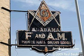 Here's an old faded out marquee for the Alabama F and A.M. The sign refers to the Most Worshipful Prince Hall Grand Lodge here in Birmingham. 04-09