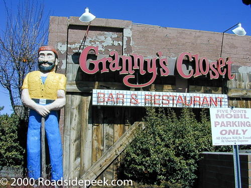 Check out the lumberjack that stands outside of Granny's Closet Bar & Restaurant. Located along busy Route 66 in the Arizona town of Flagstaff, the lumberjack at Granny's Closet has been greeting customers since 1974. At least that's when the restaurant opened, not 100% when this 10 foot tall wooden lumberjack was installed at the front.