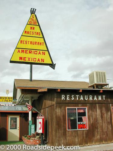 Check out this triangle sign that points the way into Mr. Maestas Family Restaurant, home of American and Mexican food. The look of this Holbrook, Arizona restaurant looks homey with its wood paneling and comfort colors.