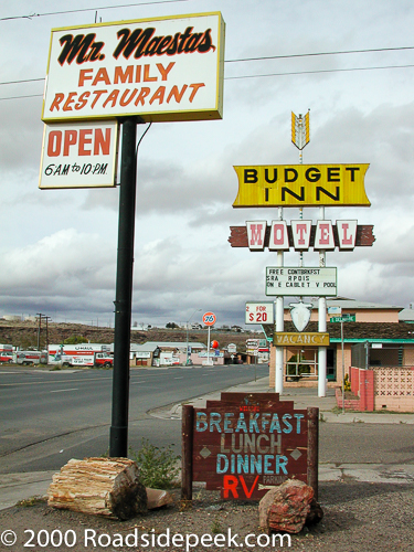 Well the yellow triangle sign is now gone and the Budget Inn Motel is kaput becoming part of the Knights Inn chain. At least Mr. Maestas Family Restaurant is still chugging along service up its hot food to hungry locals and travelers alike at 502 Navajo Boulevard or old Route 66 . 09-21