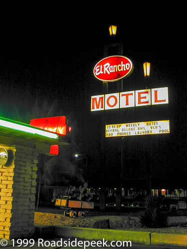 A night shot of the El Rancho Motel sign from the 90s