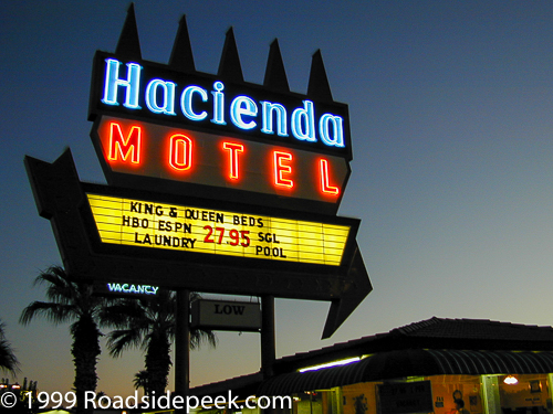 Hacienda Motel sign at night