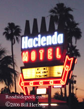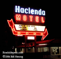 The Hacienda Motel neon marquee still blazes on brightly as it greets visitors passing down the main drag of Yuma. 12-06