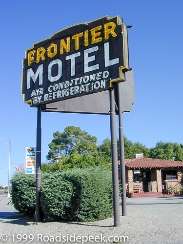 Check out the Frontier Motel located off the main highway in Tucson. The sign showcases the motel's amenities including air conditioning and air refrigeration. The motel was built in 1941 and was originally named the Pioneer Motel for a couple of years.