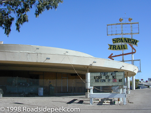 Sadly, the property has deteriorated as the decades have passed. The whole place was abandoned since when these photos were taken beginning in the late 1990s. The googie looking restaurant has been fenced off, though restaurant equipment used to still be seen on the site. Supposedly the business closed in the 1990s.