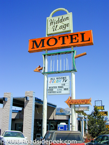 Check out this eye catching sign at the Hidden Village Motel in Flagstaff, AZ. Located off Route 66 and next door to the Saga Motel, the Hidden Village Motel features a couple of arrows that point the way into the office and the orange color is certainly eye-catching.