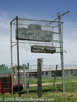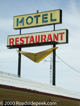 The old restaurant sign with its downward pointing boomerang arrow still stands tall over the restaurant building itself. 09-21
