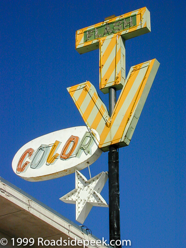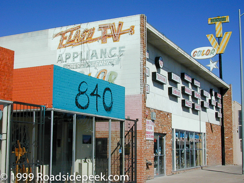 Here is the Flash TV & Appliances store located off a main road in Tucson. The sign is very distinct with its 70's looking colors and the neon appears to pop on the sign.